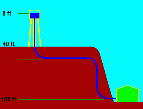 Okay, so you already know what feet means.  How about “head?”  If you pull out an unabridged dictionary you will find 70 or more definitions for the word “head.”  Yikes!  Look way, way down that list and you will find “In Physics: the vertical distance between two points in a fluid.”  That’s the definition we are using here.  So feet head is the number of vertical feet between two points.  Remember it isn’t the total distance between the points, it is the vertical distance.  Take a look at this diagram to help you understand the difference: